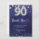 A thank you card for a 90th birthday. A navy blue background colour. The blue colour is uneven. With faux silver stars. On front: number 90 written with a balloon style font. Thank You, your text, title and a date.