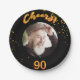 A paper plate for a 90th birthday party for guys. Template for your photo. Black background and the text: Cheers! 90. The text is written with a trendy faux gold balloon script. Golden confetti as decoration.