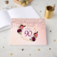 A Guest Book for a 90th birthday party. A chic golden and blush pink gradient background with a faux gold geometric frame. Decorated with dark purple and burgundy flowers, roses and boho style feathers. Rose gold drips, paint drip look on the front and the back. Templates for a name, age 90 and a date. Date of birth or the date of the party. The name is written with a hand lettered style script, pink coloured letters, age in purple and the date with black numbers. Add your text on the spine.