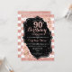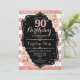 90th Birthday Party Invitation. Elegant rose gold white and black design with faux glitter. Features stylish stripes, blush pink roses, script font and confetti. Perfect for a glam milestone bday celebration.