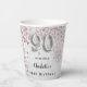 For a glamourous and girly for a 90th birthday party. A faux silver looking background. On the front and the back: Personalize and add a name, and a date. Decorated with pink and faux silver glitter dust. Number 90 is written with a balloon style font.