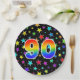This colourful, fun, and cheerful paper plate design features a large number "90" containing a rainbow spectrum gradient inspired pattern. The background features a pattern of colourful star shapes. Fun paper plates like this might be used at a celebration being held to observe somebody’s ninetieth birthday, or a couple’s ninetieth anniversary, or some other ninetieth event. [~Z0000493]