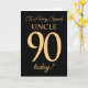 A chic 90th Birthday Card for a 'Very Special Uncle', with a number 90 composed of gold-effect numbers and the word 'Uncle', in gold-effect, on a black background. The inside message, which you can change if you wish, is 'Happy Birthday'