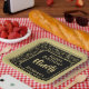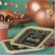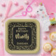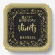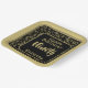 This over-the-hill design has a black and gold random number pattern with milestone number 90 repeated in varied sizes and angles. There is a black rounded square in the centre for your text, and gold and black trim around the rim.