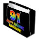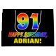 This cheerful, fun, and colourful birthday gift bag design features a large number "91" and the message "HAPPY BIRTHDAY,", both having a rainbow spectrum gradient inspired pattern colouring, along with a bold yellow custom recipient name. The background is coloured black. A fun birthday themed gift bag like this may be used to wrap a gift or present being given to celebrate somebody’s 91st birthday. [~Z0000477]