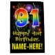 This fun, colourful, and exciting birthday gift bag design features a large number "91" with a rainbow spectrum gradient style pattern, along with the message "Happy 91st Birthday,", and a customizable recipient name. It also has a colourful background pattern inspired by the look of bursting celebratory fireworks. A gift bag like this might be used when wrapping gifts being given to somebody in celebration of their ninety first birthday. [~Z0000509]