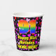 This cheerful and fun birthday paper cup design features a large number “91” having a rainbow spectrum gradient inspired pattern. It also features the message “Happy 91st Birthday,”, and a customizable name. The background features a pattern of red, pink, and purple heart shapes of various sizes. Friendly, happy paper cups like this might be fun to use at a birthday celebration being held to celebrate somebody’s 91st birthday. [~Z0000548]