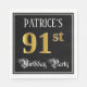 This fancy and opulent birthday-themed paper napkin design features a customizable name and the message “91st Birthday Party”. The large number “91st” has a faux/imitation gold-inspired colouring pattern, the words “Birthday Party” are in luxurious script-style text, and the background is coloured black by default (although it can be customized). Elegant, luxurious paper napkins like this might be useful to have at a birthday celebration being held to celebrate somebody’s ninety first birthday. [~Z0000565]