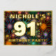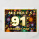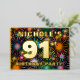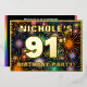 The front of this upbeat ninety-first birthday party foil invitation card design features an editable name, a large number “91st”, the message “BIRTHDAY PARTY!”, and a border. The background of the front features an exciting, colourful bursting celebratory fireworks-inspired pattern. The back features personalized details about the event, such as the date, time, place, and any other important information. Customizable invitations like these might be a fun way to invite attendees to a birthday gathering/party being held to celebrate somebody’s 91st birthday. [~Z0000602]