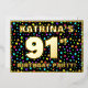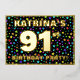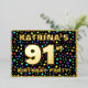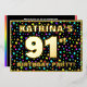 The front of this eye-catching and vibrant ninety-first birthday celebration/party foil invitation card design features a personalized name, a large number “91st”, the message “BIRTHDAY PARTY!”, and a border. The background of the front features an exciting, colourful star shapes pattern. The back features personalized details about the event, such as the date, time, location, and any other information that may be relevant. Customized invitations like these might be a fun way to invite attendees/guests to a birthday party being held to honour somebody’s 91st birthday. [~Z0000600]