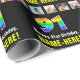 This bold and eye-catching birthday themed wrapping paper design features a large number “91“ having a vibrant multicolored rainbow spectrum inspired gradient pattern, along with the message “Happy 91st Birthday,“ and an editable recipient name. There are also photos that can be personalized, perhaps with photos of the recipient, the recipient’s family and friends, and/or the sender(s) of the gift. Upbeat birthday themed wrapping paper like this might be used when giving a gift or present in celebration of somebody’s ninety-first birthday. (Photography © Storytree Studios, Stanford, CA.) [~Z0000670]