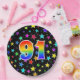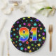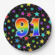 This cheerful, colourful, and fun paper plate design features a large number "91" containing a rainbow spectrum gradient inspired pattern colouring. The background features a colourful star shapes pattern. Fun paper plates like this might be used at a party being held to celebrate somebody’s 91st birthday, or a couple’s ninety first anniversary, or some other ninety first event. [~Z0000493]