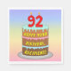 This colourful and upbeat birthday themed paper napkin design features a cartoon-style depiction of a three-tier birthday cake having number-shaped candles on top showing the age “92“, along with the message “HAPPY 92ND BIRTHDAY,”, and a customizable recipient name. The background has a multicolored pastel rainbow spectrum inspired gradient pattern. Cheerful birthday themed paper napkins like these might be used at a party for somebody who is celebrating their 92nd birthday. [~Z0000623]