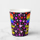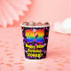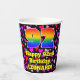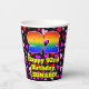 This joyful and colourful birthday themed paper cup design features a large number “92” having a rainbow spectrum gradient inspired pattern. It also features the message “Happy 92nd Birthday,”, and an editable name. The background features a pattern of heart shapes with colours like purple, pink, and red. Joyful, happy paper cups like this might be fun to use at a birthday party being held to celebrate somebody’s 92nd birthday. [~Z0000548]