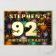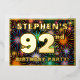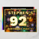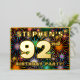 The front of this bold ninety-second birthday party foil invitation card design features a custom name, a large number “92nd”, the message “BIRTHDAY PARTY!”, and a border. The background of the front has an eye-catching, colourful pattern that resembles bursting celebratory fireworks. The back features personalized details about the event, such as the date, time, location/venue, and any other relevant information. Customized invitations like these might be a fun way to invite guests to a birthday gathering being held to honour somebody’s 92nd birthday. [~Z0000602]