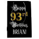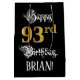 This elegant and opulent birthday gift bag design features the message “Happy 93rd Birthday,”, plus a customizable recipient name. Part of the message is in a fancy script-style text. The large number “93rd” features a faux/imitation gold-inspired look pattern. The background is coloured black. A giftbag like this might be used when wrapping gifts being given to somebody in celebration of their ninety third birthday. [~Z0000560]