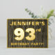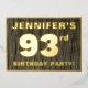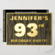 The front of this bold ninety-third birthday party/celebration foil invitation card features a personalized name, a large number “93rd”, the message “BIRTHDAY PARTY!”, and a border, all in foil. There is a rustic, yet elegant, faux wood grain appearance inspired pattern for the background of the front. The back features personalized details about the event, such as the date, time, location/venue, and any other useful information. Customizable invitations like these might be used to invite attendees/guests to a birthday gathering being held to honour somebody’s 93rd birthday. [~Z0000598]
