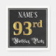 This fancy and ornate birthday themed paper napkin design features a custom name and the message “93rd Birthday Party”. The large number “93rd” has a faux/imitation gold-inspired colouring pattern, and the words “Birthday Party” are in opulent script-style text. The background is coloured black by default (although it can be customized). Opulent, luxurious paper napkins like this might be useful to have at a birthday party/celebration being held in celebration of somebody’s ninety third birthday. [~Z0000565]