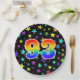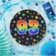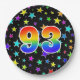 This colourful, cheerful, and fun paper plate design features a large number "93" coloured with a rainbow spectrum gradient inspired pattern. The background features a colourful pattern of star shapes. Fun paper plates like this might be used at a celebration being held in honour of somebody’s 93rd birthday, or a couple’s 93rd wedding anniversary, or some other 93rd event. [~Z0000493]