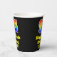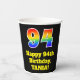 This exciting and fun birthday themed paper cup design features a large number “94” having a rainbow spectrum gradient inspired pattern. It also features the message “Happy 94th Birthday,”, and a custom name. It also has a black-coloured background. Vibrant, colourful paper cups like this might be fun to have at a birthday party/celebration being held to celebrate somebody’s 94th birthday. [~Z0000537]