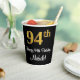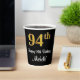 This stylish, elegant, and luxurious birthday-themed paper cup design features a large ordinal number “94th” having an imitation/faux gold-inspired gradient pattern, along with the birthday greeting message “Happy 94th Birthday,” and a personalized name in a script-style font. The background is coloured black. Birthday themed paper cups like this might be fun to use at a birthday party being held for somebody who is celebrating their ninety fourth birthday. [~Z0000538]