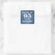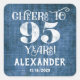 95th birthday favour tag stickers, featuring rustic blue linen burlap charm with chalkboard letters in white and personalized with name and date below.