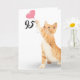 Gold tabby cat with pink heart balloon for 95th birthday on white background.