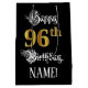 This ornate and elaborate birthday-themed giftbag design features the message “Happy 96th Birthday,”, plus a custom recipient name. Some of the message is in a fancy script-style text. The large number “96th” features a faux/imitation gold-inspired look pattern. The background is coloured black. A giftbag like this might be used when giving a gift or present in honour of somebody’s 96th birthday. [~Z0000560]