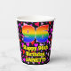 This joyful and happy birthday-themed paper cup design features a large number “96” having a rainbow spectrum gradient inspired pattern. It also features the message “Happy 96th Birthday,”, and a custom name. The background features a pattern of red, purple, and pink heart shapes. Upbeat, fun paper cups like this might be fun to have at a birthday celebration/party being held to honour somebody’s ninety sixth birthday. [~Z0000548]