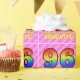 This festive and fun 96th birthday-themed wrapping paper design features a large number "96" having a colourful rainbow spectrum inspired gradient pattern. It also features the message "Happy 96th Birthday,", and a personalized name. The background features a fun pattern of light pink and dark pink stripes containing loving pink heart shapes. Wrapping paper like this might be used when wrapping gifts being given to somebody in celebration of their ninety sixth birthday. [~Z0000415]