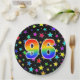 This fun, colourful, and cheerful paper plate design features a large number "96" coloured with a rainbow spectrum gradient inspired pattern. The background features a colourful pattern of star shapes. Fun paper plates like this might be used at a celebration being held to honour somebody’s ninety sixth birthday, or a couple’s 96th anniversary, or some other ninety sixth event. [~Z0000493]