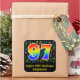 This fun, colourful, and vibrant birthday sticker design features a large number "97" having a rainbow spectrum gradient inspired pattern. It also features the message "Happy 97th Birthday,", and a personalized name. Part of the background has a colourful music notes and symbols pattern. Fun, editable birthday stickers like this might be used as a birthday celebration decoration, or perhaps given as a birthday present, or perhaps be used when wrapping birthday gifts being given to celebrate a singer’s, a song composer’s, a musician’s, or somebody else’s 97th birthday. [~Z0000423]