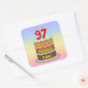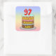 This upbeat and cheerful birthday themed square sticker design features a cartoon-style depiction of a three-tier birthday cake having numeral-shaped candles on top showing the number “97“, along with the message “HAPPY 97TH BIRTHDAY,”, and a custom recipient name. The background features a multicolored pastel rainbow spectrum inspired gradient pattern. Stickers like these might be used when celebrating somebody’s ninety seventh birthday. [~Z0000624]