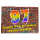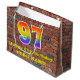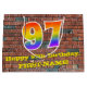 This fun and vibrant birthday-themed gift bag design, inspired by urban art and graffiti, features a large number "97" with a rainbow spectrum gradient inspired pattern, along with the message "Happy 97th Birthday,", and a personalized name. The background features a brick wall style pattern. A gift-bag like this might be used when wrapping gifts being given to somebody in celebration of their ninety seventh birthday. [~Z0000522]