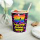 This joyful and fun birthday-themed paper cup design features a large number “97” with a rainbow spectrum gradient inspired pattern, along with the message “Happy 97th Birthday,”, and a personalized name. The background features a pattern of red, pink, and purple heart shapes of various sizes. Fun, loving paper cups like this might be fun to use at a birthday party being held to celebrate somebody’s ninety seventh birthday. [~Z0000548]