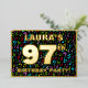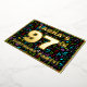 The front of this upbeat ninety-seventh birthday party/celebration foil invitation card design features a custom name, a large number “97th”, the message “BIRTHDAY PARTY!”, and a border. The background of the front features an eye-catching, multicolored pattern of musical notes and symbols. The back features personalized details about the event, such as the date, time, place/venue, and any other useful information. Personalized invitations like these might be a fun way to invite guests to a birthday gathering being held to celebrate somebody’s 97th birthday. These might be more meaningful for a music-themed birthday party. [~Z0000601]