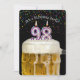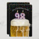 Number 98 candle in mug of beer with colourful confetti on black for 98th birthday party invite.