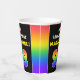 This fun and bold birthday themed paper cup design features a large number “98“ having a multicolor rainbow spectrum inspired gradient pattern, along with the message “HAPPY 98th BIRTHDAY,”, and a custom recipient name. Birthday themed paper cups like this might be fun to use at a birthday party being held for somebody who is celebrating their 98th birthday. [~Z0000639]