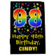 This exciting, vibrant, and colourful birthday themed gift bag design features a large number "98" with a rainbow spectrum gradient style pattern, along with the message "Happy 98th Birthday,", and a custom recipient name. It also has a background pattern featuring star shapes of various sizes and colours. A birthday themed gift bag like this might be a fun way to wrap a gift or present being given to somebody who is celebrating their 98th birthday. [~Z0000510]