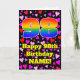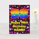 The front of this colorful and happy birthday-themed greeting card design features a large number “98” having a rainbow spectrum gradient inspired pattern. It also features the message “Happy 98th Birthday,”, and an editable name. The background of the front features a pattern of heart shapes with colors like purple, red, and pink. The inside has a personalized birthday greeting message, or could perhaps be cleared and left blank if a message is to be written by hand instead. A cheerful, personalized birthday greeting card like this might be used to celebrate somebody’s ninety-eighth birthday. [~Z0000551]