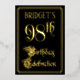The front of this elegant and fancy foil ninety-eighth birthday party/celebration invitation design features the message “98th Birthday Celebration” in luxurious script-style text. It also features an editable name. The background of the front is coloured black by default (although it can be customized to a different colour). The back features personalized details about the event, such as the date, time, location, and any other information that may be relevant. Luxurious, opulent, editable invitations like these might be used to invite guests to a birthday party being held to honour somebody’s 98th birthday. [~Z0000589]