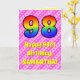 The front of this cheerful and happy 98th birthday themed greeting card design features a large number "98" having a colorful pattern inspired by the appearance of a rainbow spectrum. It also features the message "Happy 98th Birthday,", followed by a custom recipient name. The background of the front features a fun pattern of dark pink and light pink stripes containing loving pink heart shapes. The inside features an editable birthday greeting message, or could perhaps be cleared and left blank if a message is to be written by hand instead. A customizable birthday card like this might be a fun way to send a message in celebration of somebody’s ninety eighth birthday. [~Z0000416]
