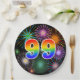 This fun, colourful, and cheerful paper plate design features a large number "99" coloured with a rainbow spectrum gradient inspired pattern. It also features a vibrant and exciting bursting celebratory fireworks inspired pattern. The background is coloured black. Paper plates like this might be used at a party celebrating somebody’s 99th birthday, a 99th anniversary, or some other ninety ninth event. [~Z0000490]