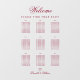 All text is burgundy red. The word Welcome is written in an elegant calligraphic script, the rest in caps. The 9 tables are on 3 rows. Above them and under the word Welcome, there is the message "Please find your seat!". In the lower part, under the tables, there is a small heart and the names of the bride and groom, written in the same calligraphy.