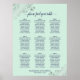 Ce beau tableau de sièges mariage de 9 tables comprend des assignations de tables pour 90 personnes, avec 10 personnes à chaque table. Le design est simple mais élégant avec du texte bleu marine sur un arrière - plan vert clair ou de couleur néo-menthe et dispose de fraises en faux papier gris argenté en dentelle dans les coins et un titre de calligraphie de script fantaisie lisant "s'il vous plaît trouver votre table." Sophistiqué et chic.