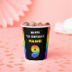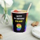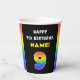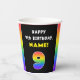 This fun and cheerful birthday themed paper cup design features a big number “9“ having a vibrant rainbow spectrum inspired gradient pattern, along with the message “HAPPY 9th BIRTHDAY,”, and a custom recipient name. Birthday themed paper cups like this might be used at a party celebrating somebody’s ninth birthday. [~Z0000639]