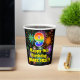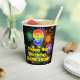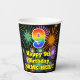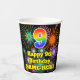 This fun and cheerful birthday paper cup design features a large number “9” with a rainbow spectrum gradient inspired pattern, along with the message “Happy 9th Birthday,”, and a customizable name. The background features a multicolored pattern inspired by the appearance of bursting celebratory fireworks. Vibrant, colourful paper cups like this might be fun to use at a birthday celebration/party being held in celebration of somebody’s 9th birthday. [~Z0000539]