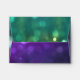 A2 RSVP Response Card Envelopes preprinted with your return address and designed to coordinate with a wide range of wedding invitations, party invites, bridal and baby showers, thank you notes and announcements. An hand drawn scroll swirl curly cue frame in gold metallic look glitter is on the front for you to write or print the address you're sending it to and on the back flap a similar coordinating shape for your preprinted return addresses. (NOTE: THIS IS A FLAT PRINTED INVITATION THERE IS NO ACTUAL GLITTER OR GOLD METALLIC INKS USED) A hand made bokeh twinkling lights sparkle shimmer image in peacock colours is the outside colour - purple, violet, blue, persian blue fading to green. Inside is a multi-colour and size gold glitter image. Graphically designed by Audrey Jeanne Roberts