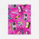 A fleece blanket that is comfy and cozy, this 80's inspired retro design features a lively pink background with elements of that era such as colourful sunglasses, boom boxes, bright musical instruments, etc.  There are also palm trees in the background also.  Choose from three different sizes.