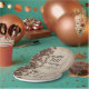 A baby boy is brewing baby shower party plates with coffee beans on a rustic wood background.